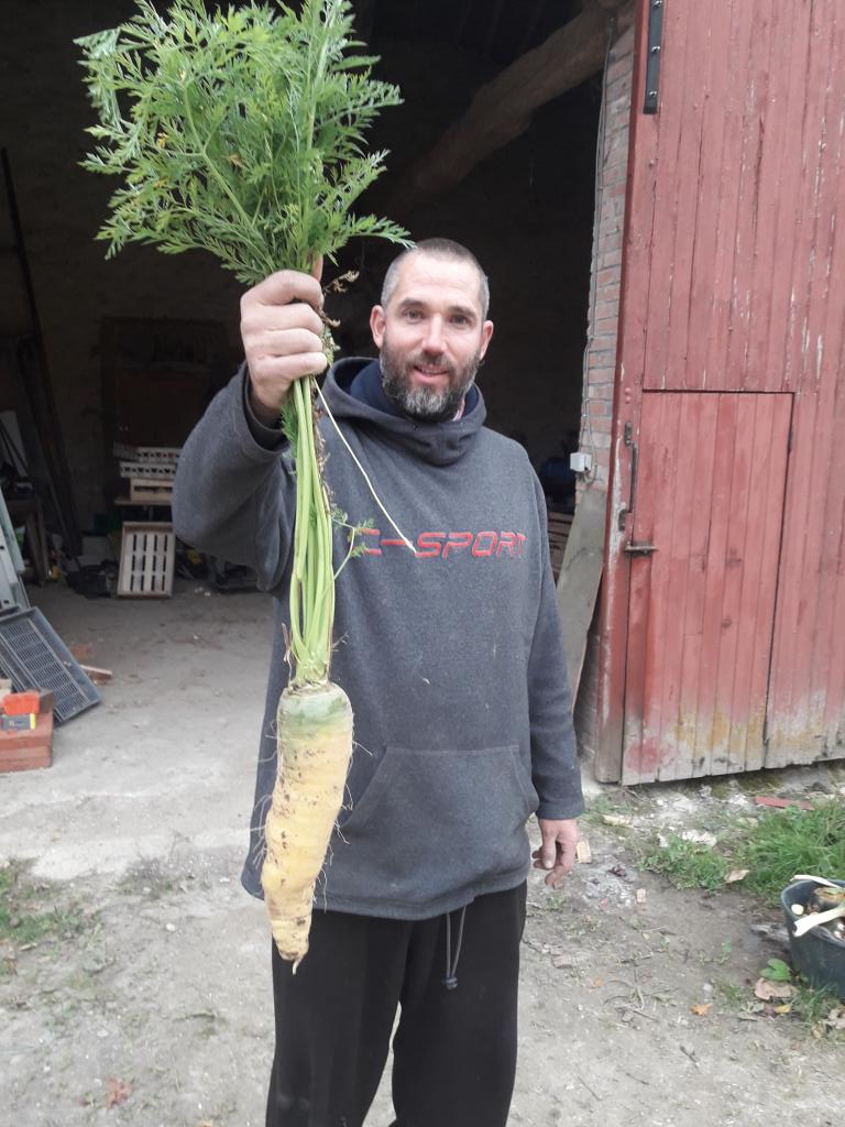 Cette semaine à la ferme, nous avons continué les ramassages des légumes de conservation pour l’automne/hiver. Fin du ramassage des pommes de terres (chérie, désirée, ondine…) et stockage en cave. Début du ramassage des carottes (Dolciva, jaune de Doubs) et stockage en silo. Pour le ramassage des ces dernières, nous avons utilisé un nouvel outil sur notre micro-tracteur …une lame souleveuse ! Cela nous épargne d’innombrables heures de grelinette pour ramasser les 500m linéaires de planches de carottes ! D’ailleurs, vous trouverez une photo de notre championne ci-dessous. Combien pèse-t-elle selon vous ? Un panier surprise offert à celui qui répond au plus proche.