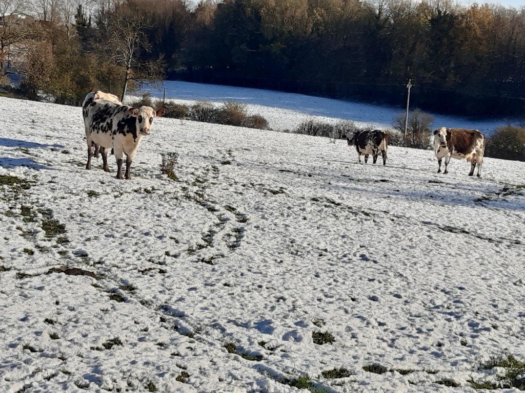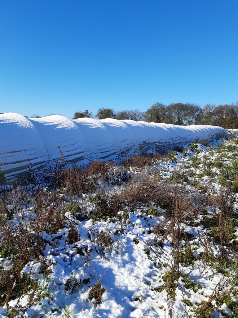 Cette semaine a vu le retour de la neige et du gel, les plantations d’été encore sous les serres n’ont pas survécus ! Les paysages sont recouverts de blanc, les vaches marchent prudemment sur la neige et les serres sont très sombres avec le manteau de neige dessus.