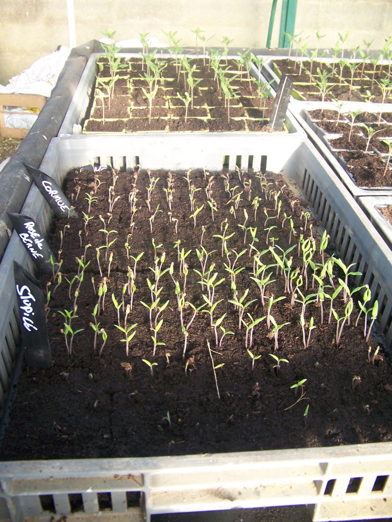 En ce mois de Mars, nous avons commencé à semer et planter pour les légumes primeurs (salades, bettes, carottes, pommes de terres, radis …). Mais surtout, nous sommes très occupés par la pépinière. A partir de nos semences reproductibles, celles de nos partenaires de l’association Triticum, et celles que nous achetons à des semenciers bio, nous semons en mottes et en godets. Ils trouvent dés lors leur place sur la couche chaude ou sur la table de semis et après quelques jours, les premières graines se mettent à lever.