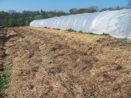 Cette semaine au jardin, nous avons continué les semis en pépinière, le rempotage en godets des plants qui manquaient de place dans leur petite motte. Nous avons également mis en culture une serre de pomme de terre, préparé une zone pour les courges (fumier, travail du sol et paillage). En fin de semaine dernière, nous avons même commencé l’implantation de nos tomates précoces, bien au chaud dans une serre (English Rose, Stupice, Karos, Carorich, Merveille des marchés, Ananas …). Elles ont rejoint des concombres (Le généreux) et courgettes (Coucourzelles) implantées précédemment. Nous y apportons beaucoup de soin pour vous proposer ces légumes rapidement sur notre étal.