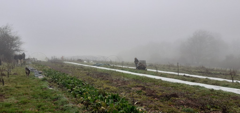 Cette semaine, les maraichers ont ressorti les tricots de peau 😉 dur les doigts dans le froid! Gros travail autour des serres, nous les avons déplacé pour les positionner au dessus des semis de carottes de la Toussaint. Ces carottes sont juste sorties de terre et ont 3 vraies feuilles, en les protégeant avec ces serres, elles vont rester toutes petites jusqu’au mois de février et regrossiront pour récolte au printemps en primeurs.