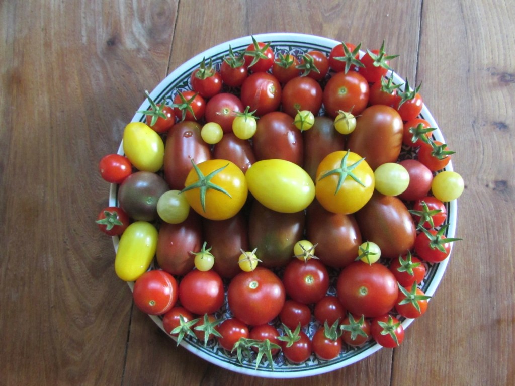 Cette année, elles auront un peu tardé à murir mais l’attente valait le coup! Quel délice nos tomates cerises, belles, bonnes, de toutes les formes et de toutes les couleurs, vous allez être séduits! Là aussi nous nous sommes fait plaisir en essayant un tas de variétés paysannes (ou anciennes): les cocktail clémentine, calabash rouge, Anna Aasa, poire jaune, black cherry, groseilles jaunes, matt’s wild cherry… et bien d’autres encore. Superbes pour une assiette apéro mandala ou pour tester des recettes: clafoutis salés de tomates cerises, crumbles, tomates cerises marinées en conserve… Rapportez-nous vos expériences!