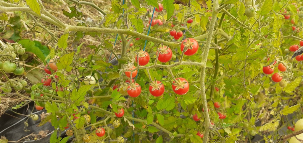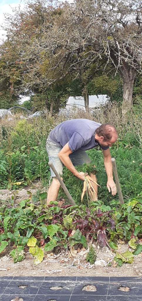 Cette semaine, gros travail d’éclaircissement! Dépressage de carottes (qui nous ont offert de merveilleuses poêlées!) et grosse taille dans la dernière serre à tomates qui tournait à la forêt vierge. Cette serre commence à mûrir et va renforcer notre offre de la deuxième partie de saison. Les premières serres se sont épuisées plus vite que la normale avec la canicule. Les semis de la semaine dernière lèvent bien 😉 Salades, bettes, navets… objectif 1ères récoltes en octobre/novembre!
