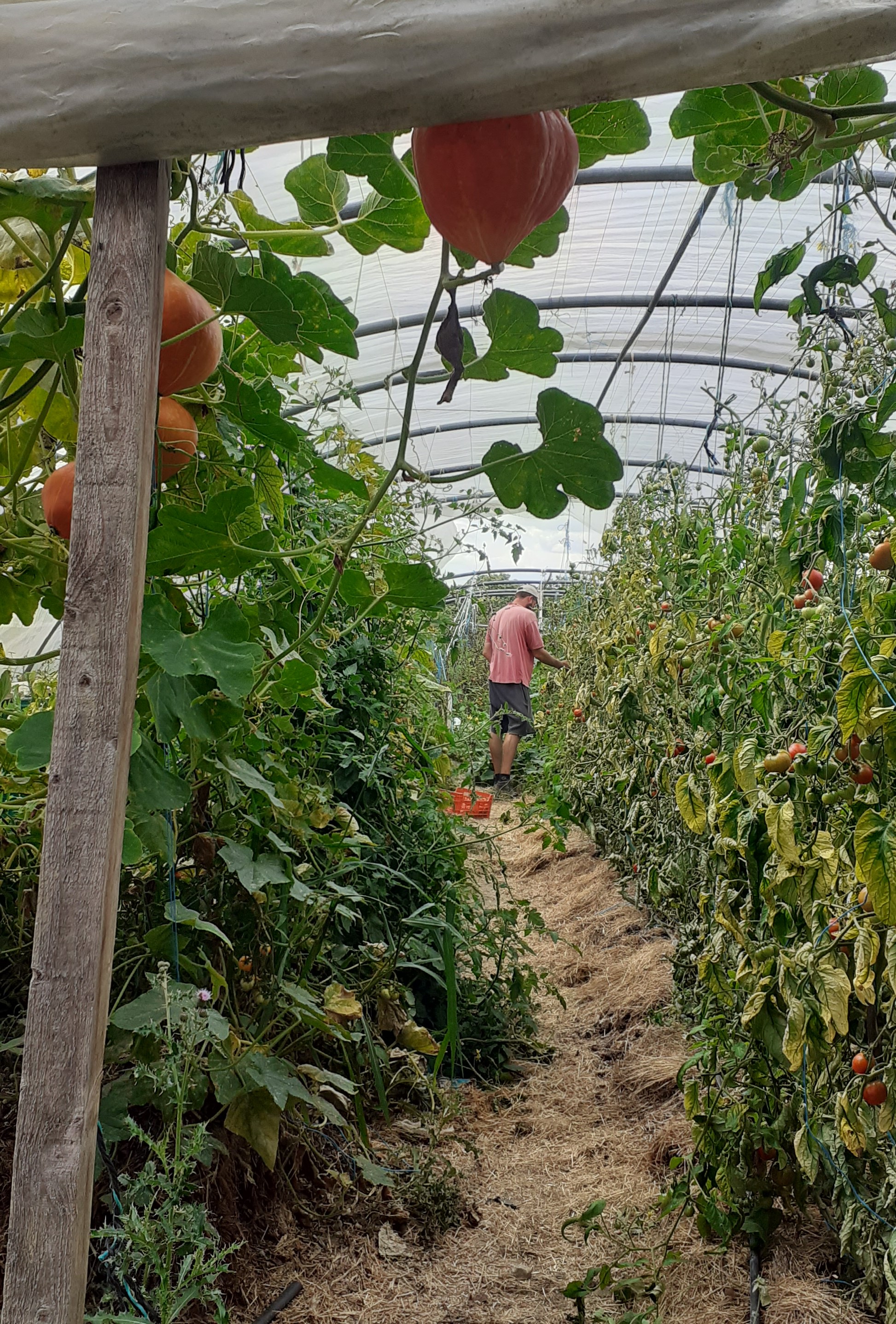 Et les petits travaux divers: gros dépressage de carottes (ça y est, c’est fini!), récolte des oignons (pour libérer des planches), semis des épinards (sur les planches ainsi libérées)… A titre perso, nous profitons de l’arrivée de tomates pour nous faire un peu de stock de conserves, on était bien contents d’ouvrir nos pots de ratatouilles et sauce tomates cet hiver!
