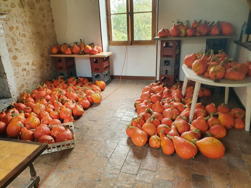 Si l’activité du jardin est moins intense, les jardiniers ne chôment tout de même pas. Nous avons encore une fois cette année cultivé certains légumes pour en multiplier les semences. Vous n’avez pas encore le plaisir d’y gouter… l’an prochain! En attendant nous, on se délecte avec le patidou. C’est une petite courge que l’on utilise souvent en déco -c’est vrai qu’elle est jolie- alors que sa chair est fine et sucrée, nous, nous mangeons même la peau qui une fois cuite devient très tendre.