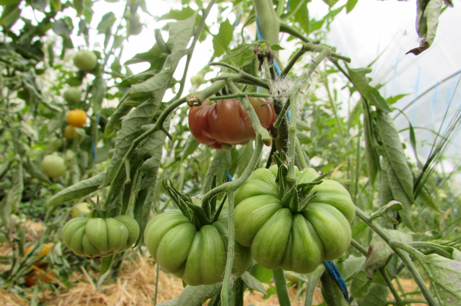 Cette semaine, nous avons effeuillés les tomates, cela permet de ralentir la propagation du mildiou dans les serres qui ont encore beaucoup de tomates. En réaction le pied hâte sa production en accélérant la maturation de ses fruits… instinct de survie!